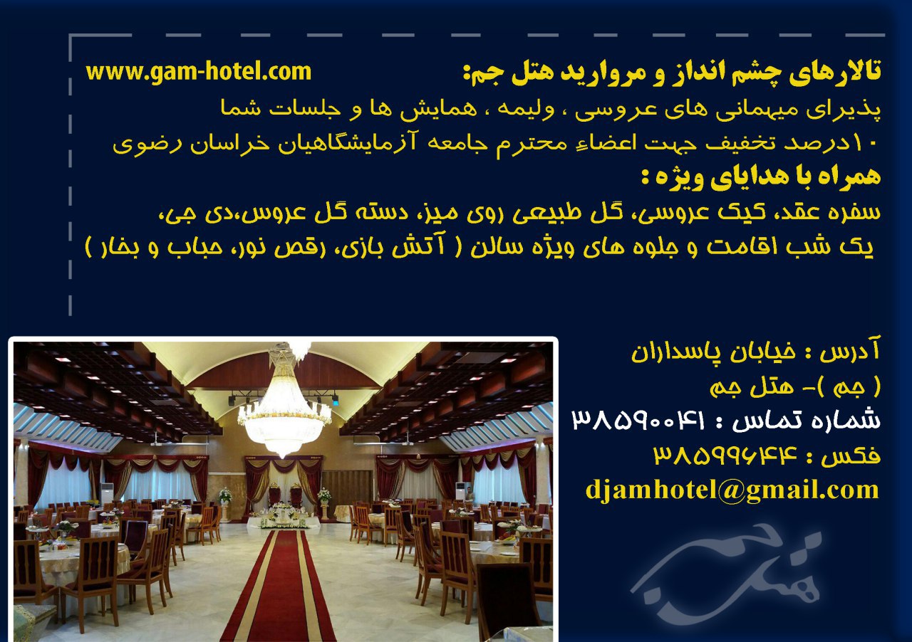 باعنایت به مذاکرات به عمل آمده بین واحد رفاهی (جابک خراسان رضوی) و مدیریت، هتل جم افتخار دارد خدمات تالار و پذیرایی خود را جهت برگزاری مراسم عروسی، ولیمه، جلسات و همایش ها برای معرفی شدگان آن مجموعه ی محترم با 10% تخفیف نسبت به قیمت درج شده در منوی رسمی هتل مندرج در سایت (حداقل قیمت منوی غذایی بر اساس هتلهای همردیف ارائه نماید. لذا خواهشمند است جهت استفاده از تسهیلات رفاهی جابک بعد از دریافت برگه معرفی از طریق سایت جامعه و یا نمایندگان واحد رفاهی با تلفن اعلام شده ذیل تماس برقرار نمائید. لازم به ذکر است هدایای ویژه جهت مراسم عروسی سفره عقد و کیک عروسی ( به انتخاب و سلیقه مهمان) ، گل طبیعی روی میز های پذیرایی، گلدست عروس، موزیک، آتشبازی داخل سالن، یک شب اقامت می باشد.