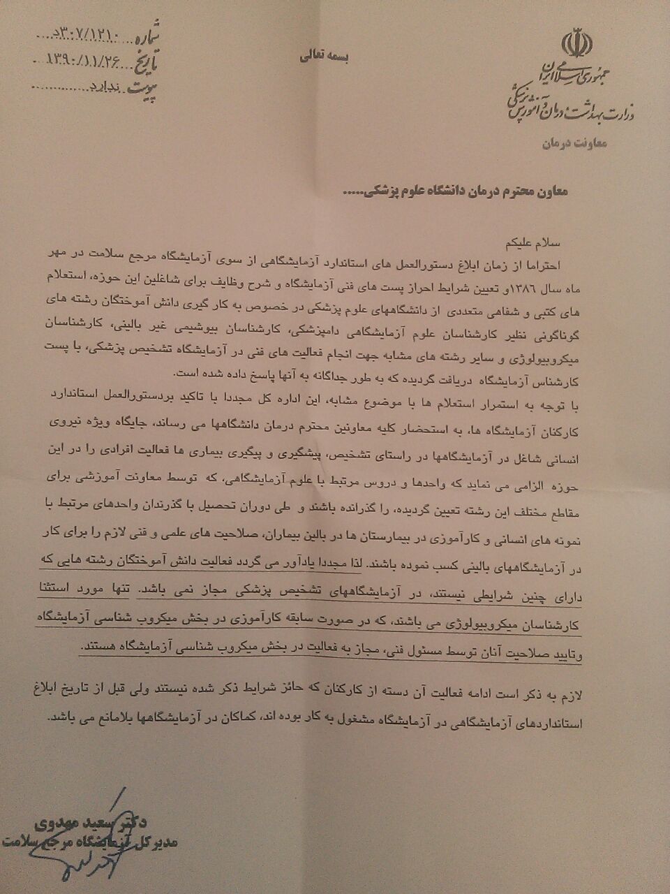 2- پی گیری نامه دکتر سعید مهدوی مدیرکل آزمایشگاه مرجع سلامت در خصوص بکار نگرفتن دانش آموختگان رشته های غیر علوم آزمایشگاهی در بخشهای فنی آزمایشگاه های تشخیص طبی