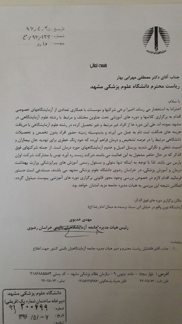 اعتراض هیات مدیره به دوره کارورزی آزمایشگاه تشخیص طبی توسط شرکت شرکت زیست ره آورد توس و آزمایشگاه نوین مشهد